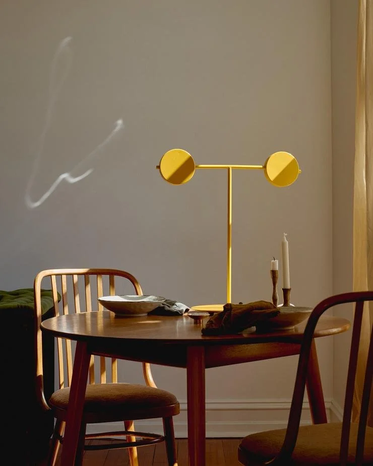 The articulated design allows the disc-shaped shades to rotate for dual functions of task and feature lighting, or both at once.
